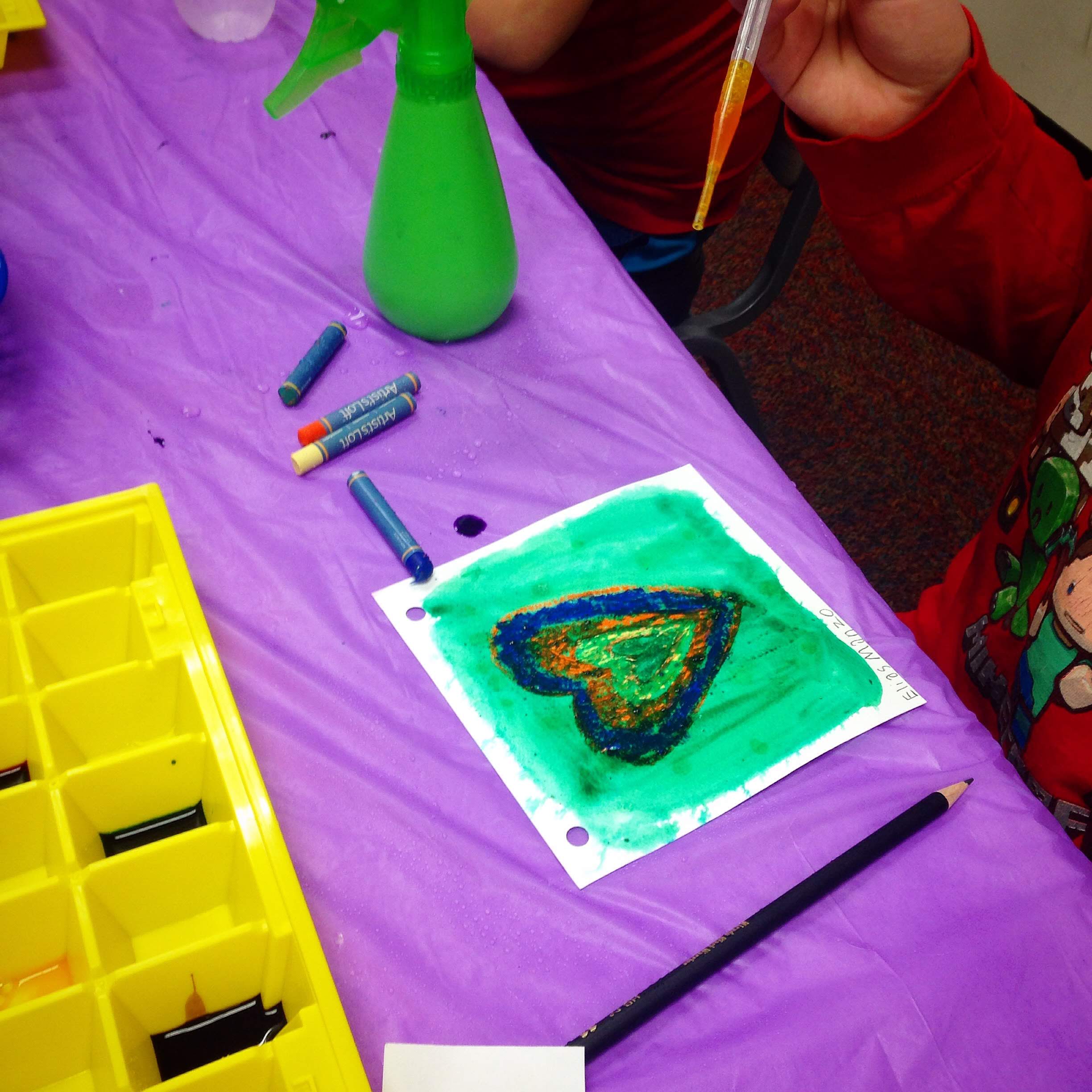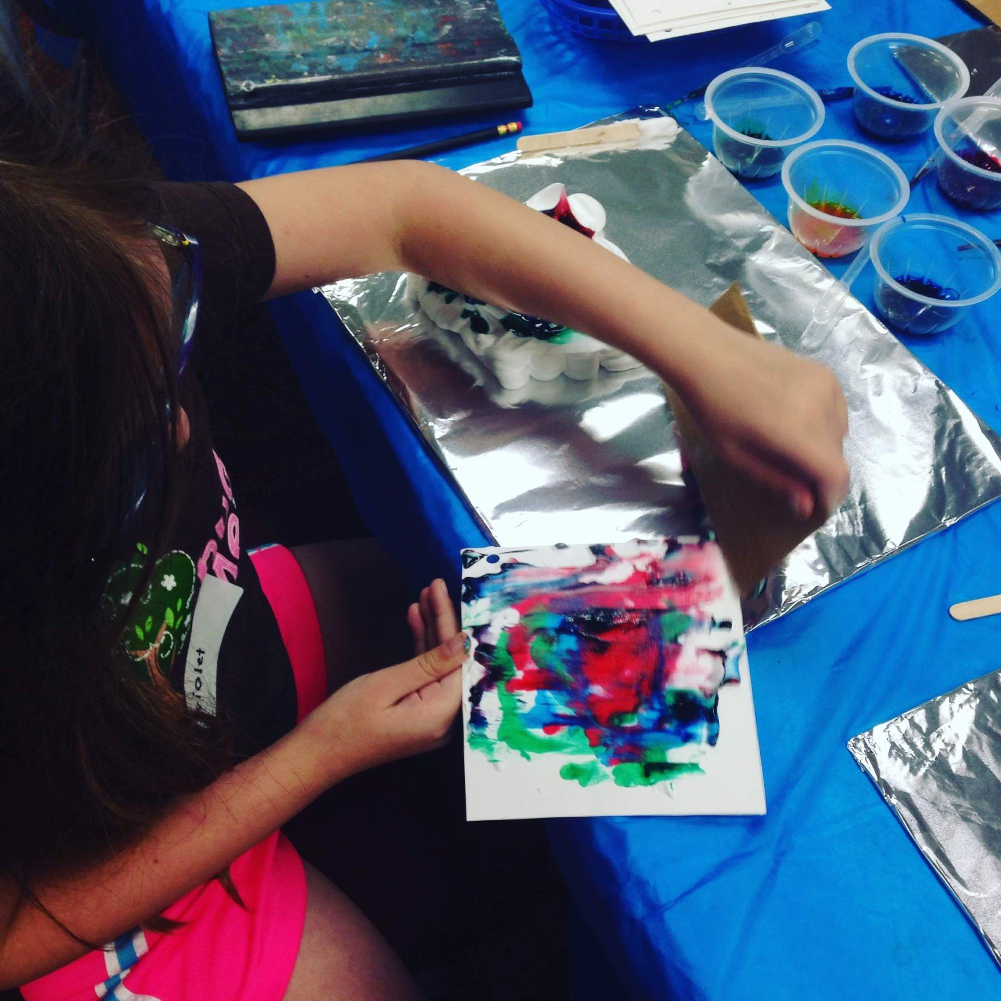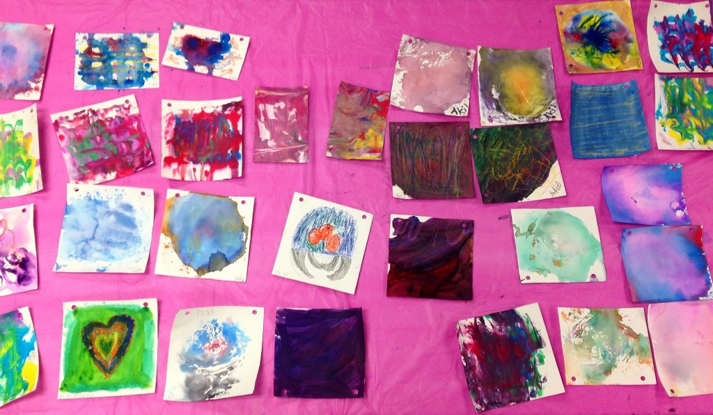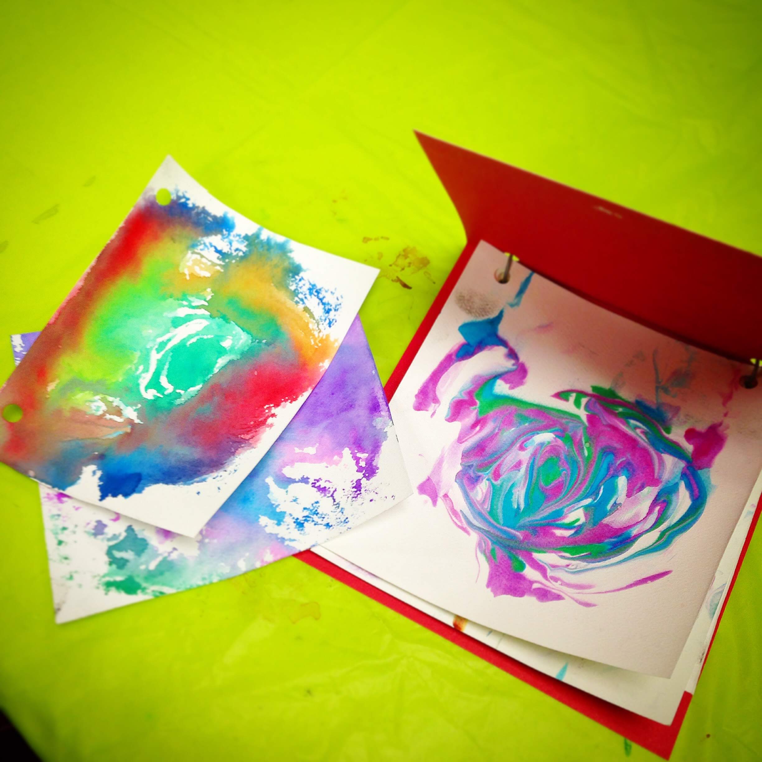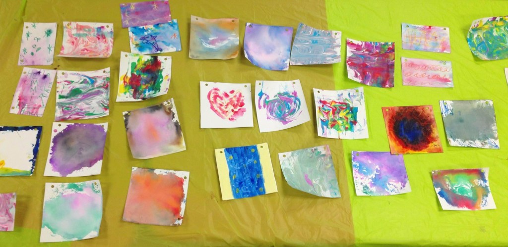 Groups rotated through three stations; watercolor experiments, marker transfers and shaving cream paper marbling. Groups spent about 10 minutes making in each space, completing one or two experiments each.