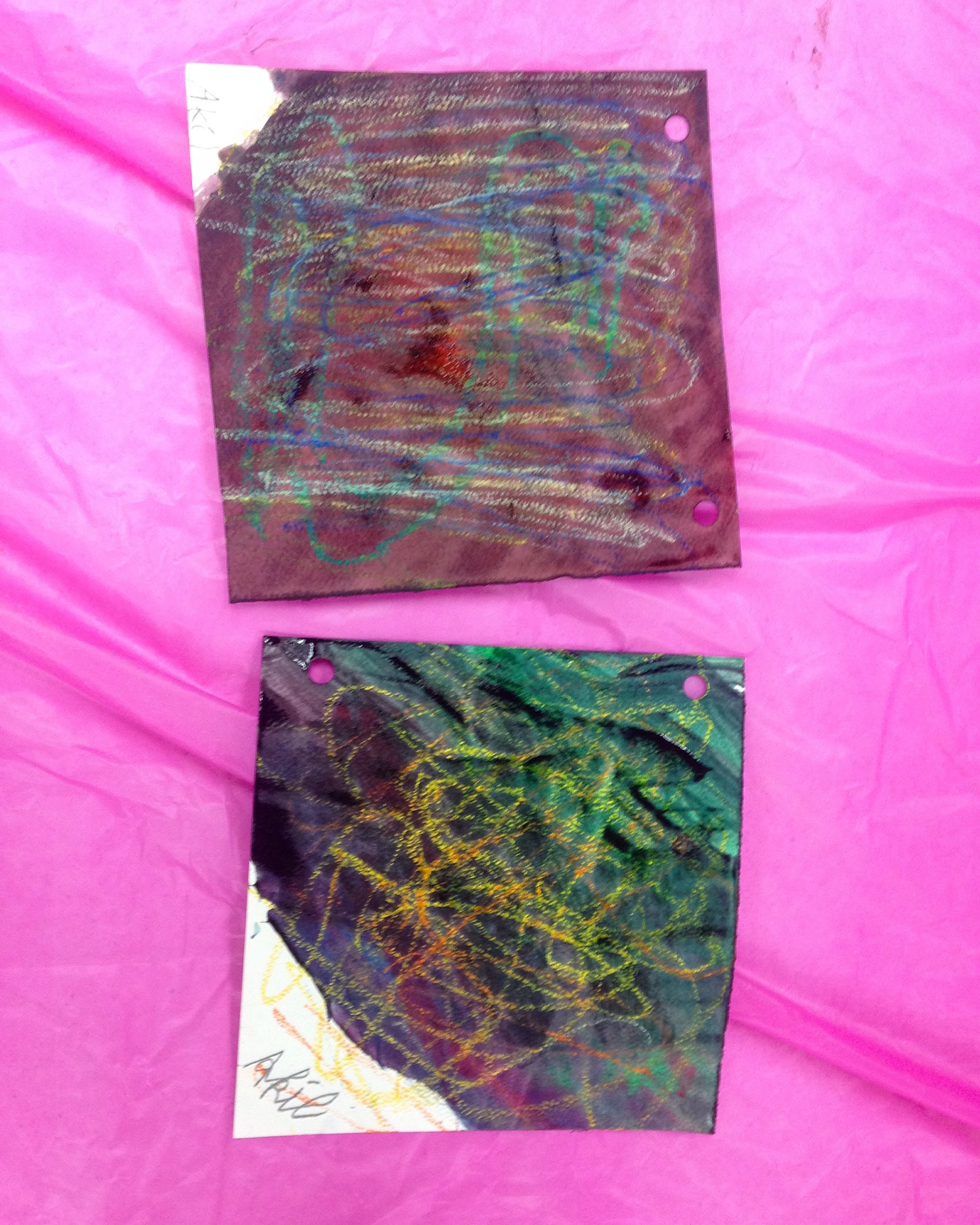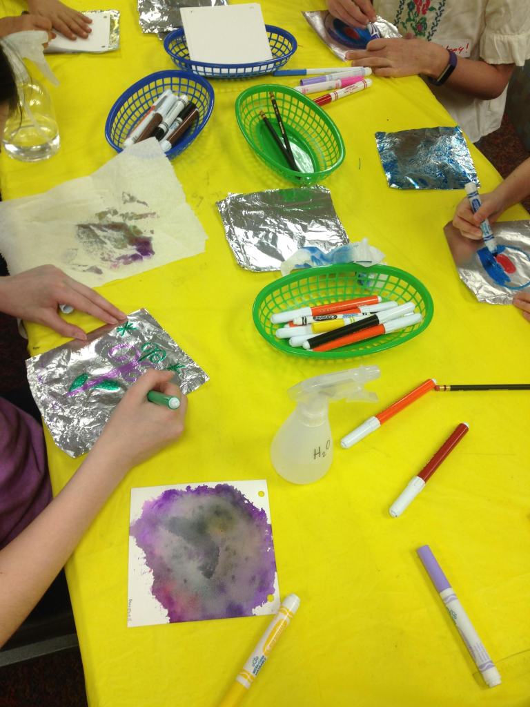 In marker transfers, students drew an abstract design with markers on aluminum foil. When the drawing was complete, they spritzed the foil with water and smoothed watercolor paper on top.