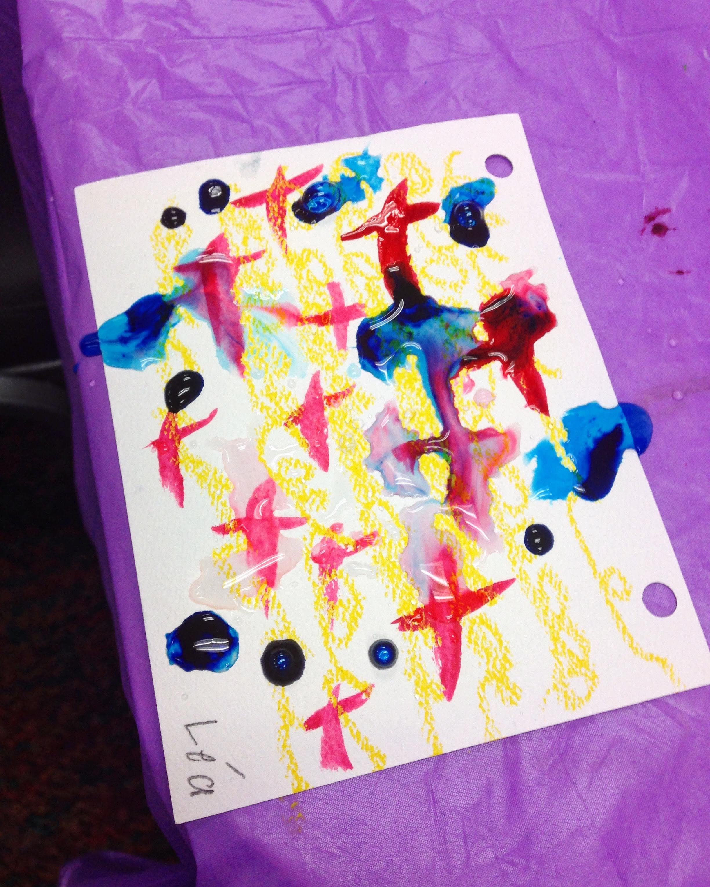 In watercolor, students tested solvency and fluid paths. Our tools were Dick Blick Liquid watercolor, brushes, spray bottles, water droppers, and oil pastels.