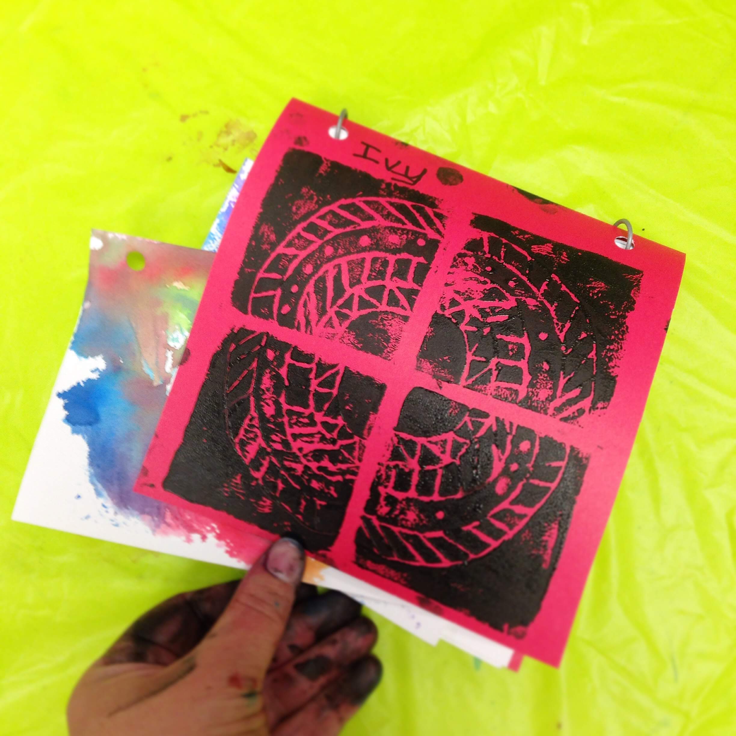 After a quick clean-up, I demoed radial designs and students created relief blocks with 2″ styrofoam plates. We printed with black block ink on colorful paper, which became the covers for their bound experiments.
