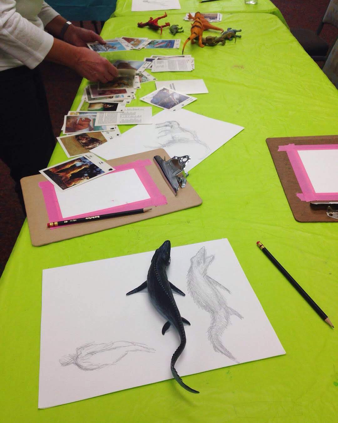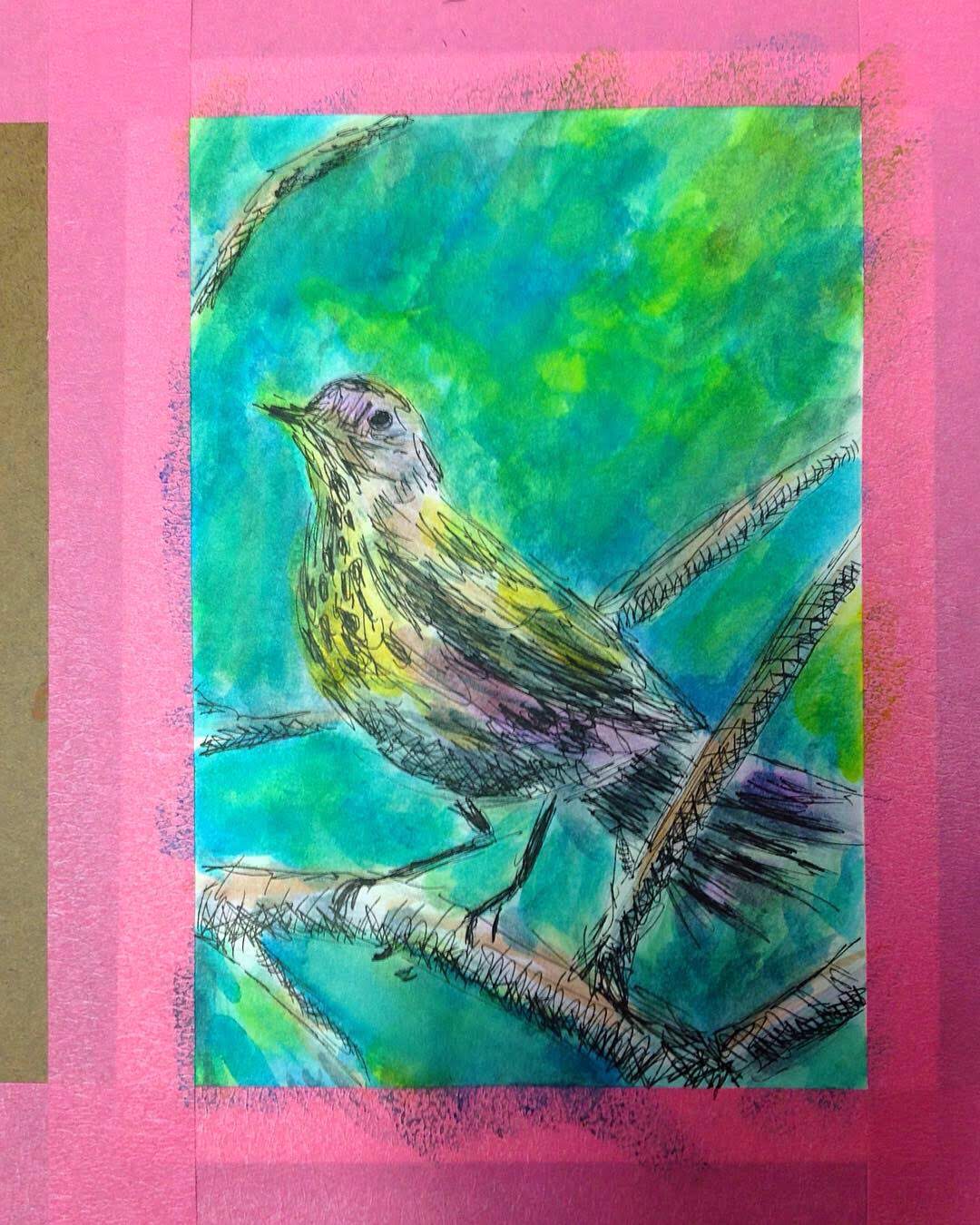 In our first session, I introduced gesture drawing and students practiced with each other and then toy dinosaurs as models. Next, we transitioned into mark making with 02 Micropens, using fine line methods like hatching, cross hatching, stippling and gestural. In the end, after a few quick experiments with liquid watercolor, students used vintage nature cards as reference for a three layered drawing/painting.